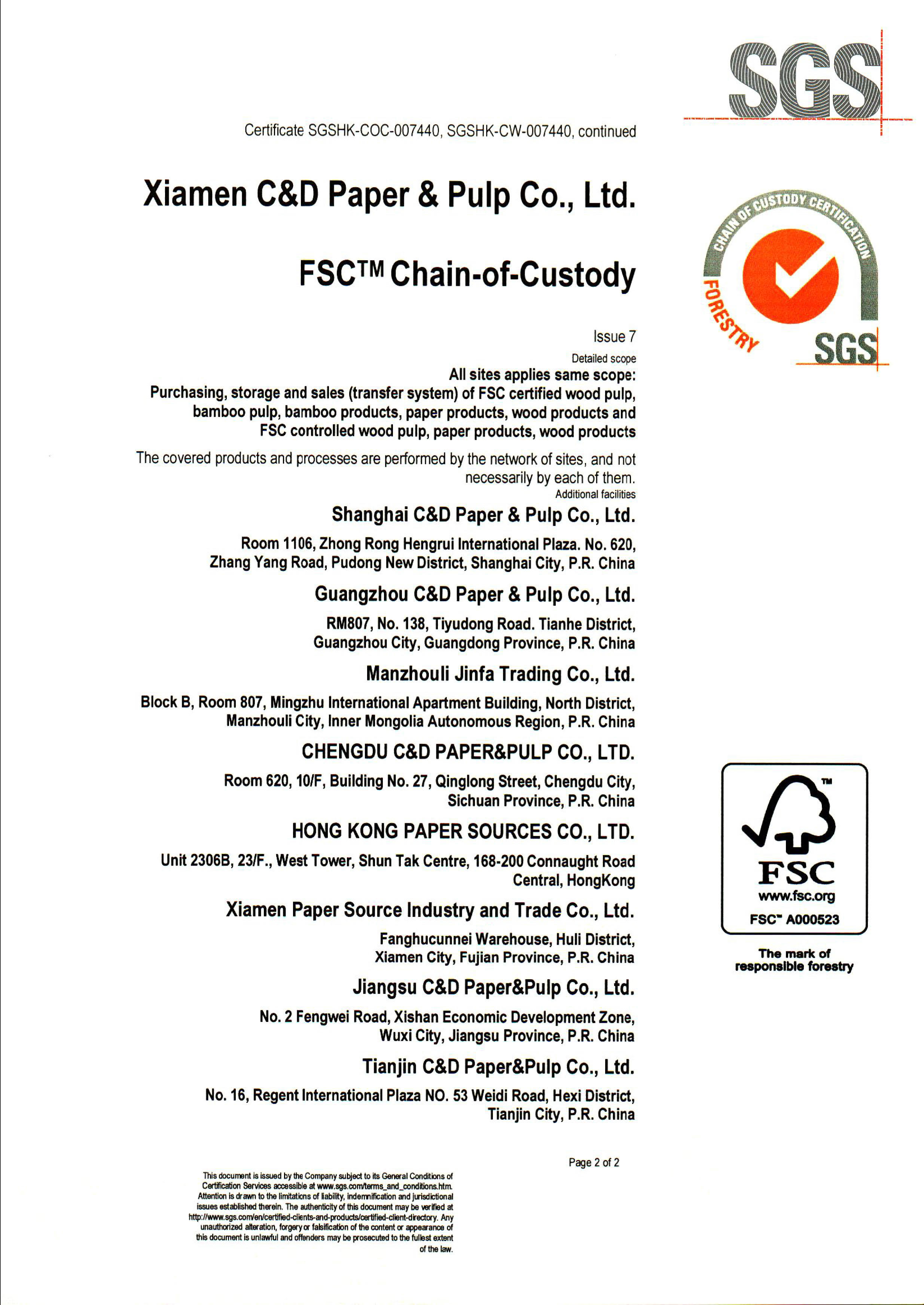 We provide "one-stop"comprehensive supply chain services of forest,pulp and paper to global customers for ordering, transportation, insurance, warehousing, disutribution and financing. And we have obtained FSC-COC certificate.